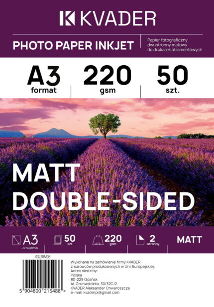 • **Jakość Premium**: Nasz Premium papier fotograficzny KVADER to gwarancja nieskazitelnej jakości obrazu. Zapewnia on wyjątkową ostrość, doskonałą reprodukcję kolorów oraz trwałość zdjęć, które przetrwają przez pokolenia.